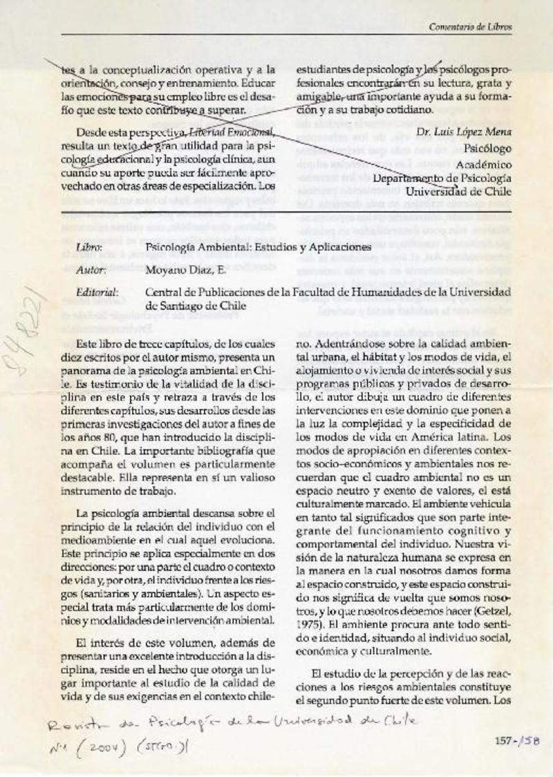 Autores chilenos - Moyano Díaz, Emilio - Psicología ambiental, estudios y aplicaciones