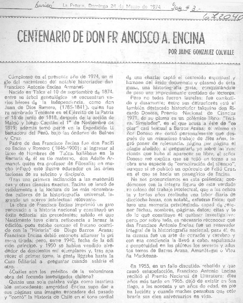 Centenario de don Francisco A. Encina [artículo] Jaime González Colville.