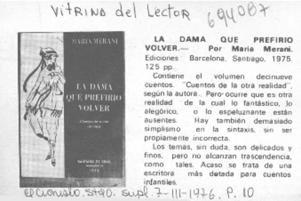 Autoras chilenas - Merani, María - Dama que prefirió volver