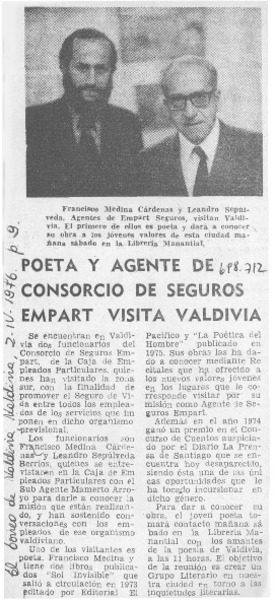 Poeta y agente de consorcio de seguros Empart visita Valdivia. [artículo]