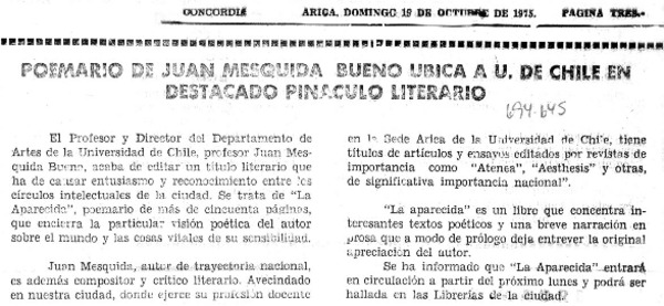 Poemario de Juan Mesquida Bueno, ubica a U. de Chile en destacado pináculo literario. [artículo]