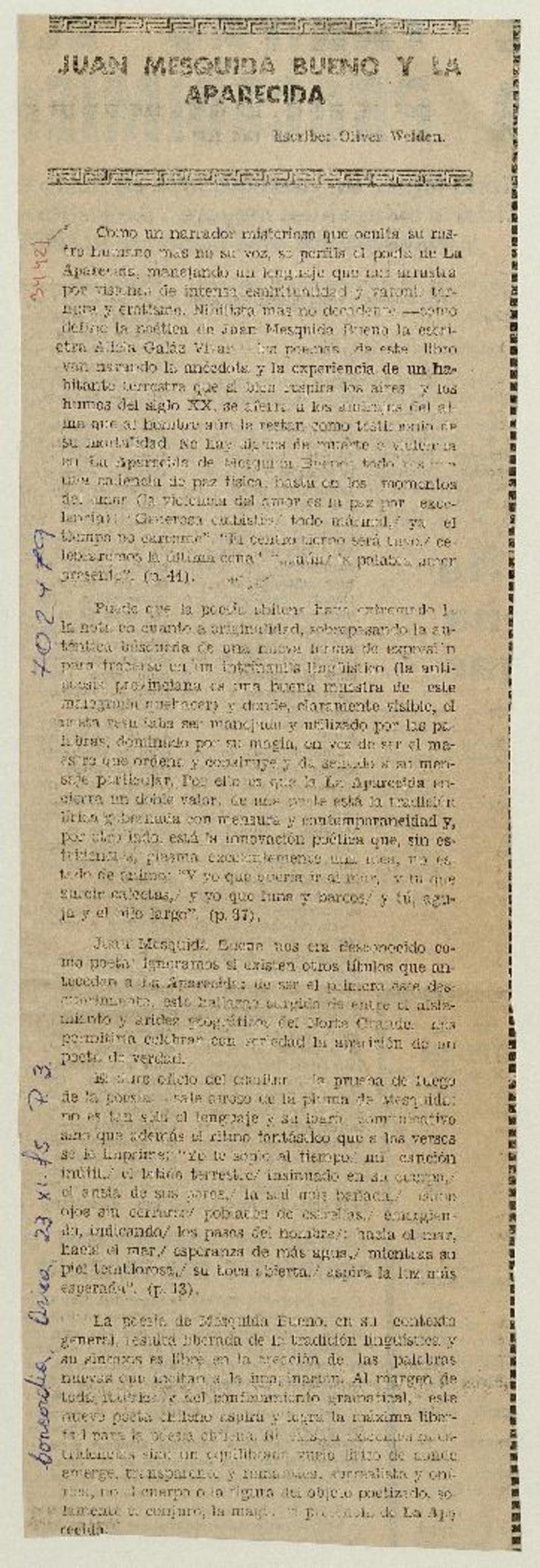 Juan Mesquida Bueno y La aparecida [artículo] Oliver Welden.