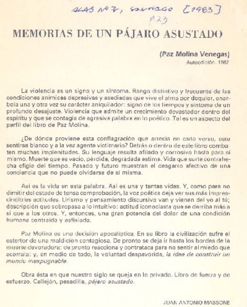 Memorias de un pájaro asustado [artículo] Juan Antonio Massone.