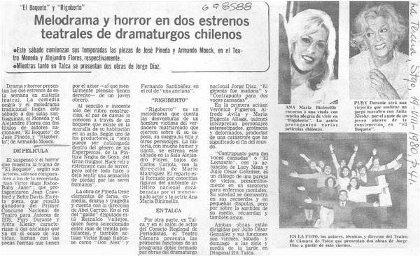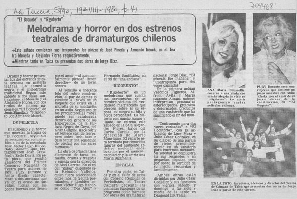 Melodrama y horror en dos estrenos teatrales de dramaturgos chilenos. [artículo]