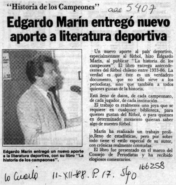 Edgardo Marín entregó nuevo aporte a literatura deportiva [artículo].