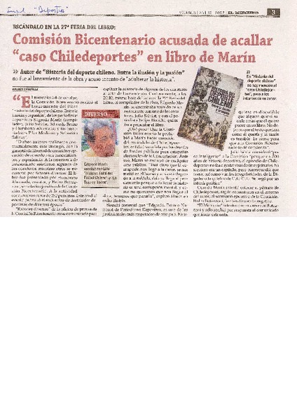 "Comisión Bicentenario acusada de acallar "caso Chiledeportes" en libro de Marín [artículo] Andrés González.