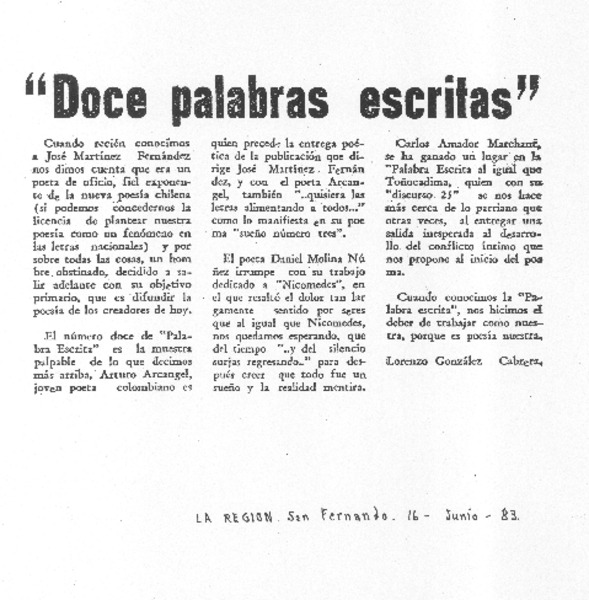 Doce palabras escritas [artículo] Lorenzo González Cabrera.