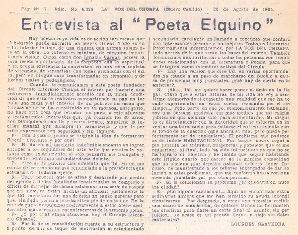 Entrevista al "Poeta elquino" : [entrevista] [artículo] Lourdes Saavedra.