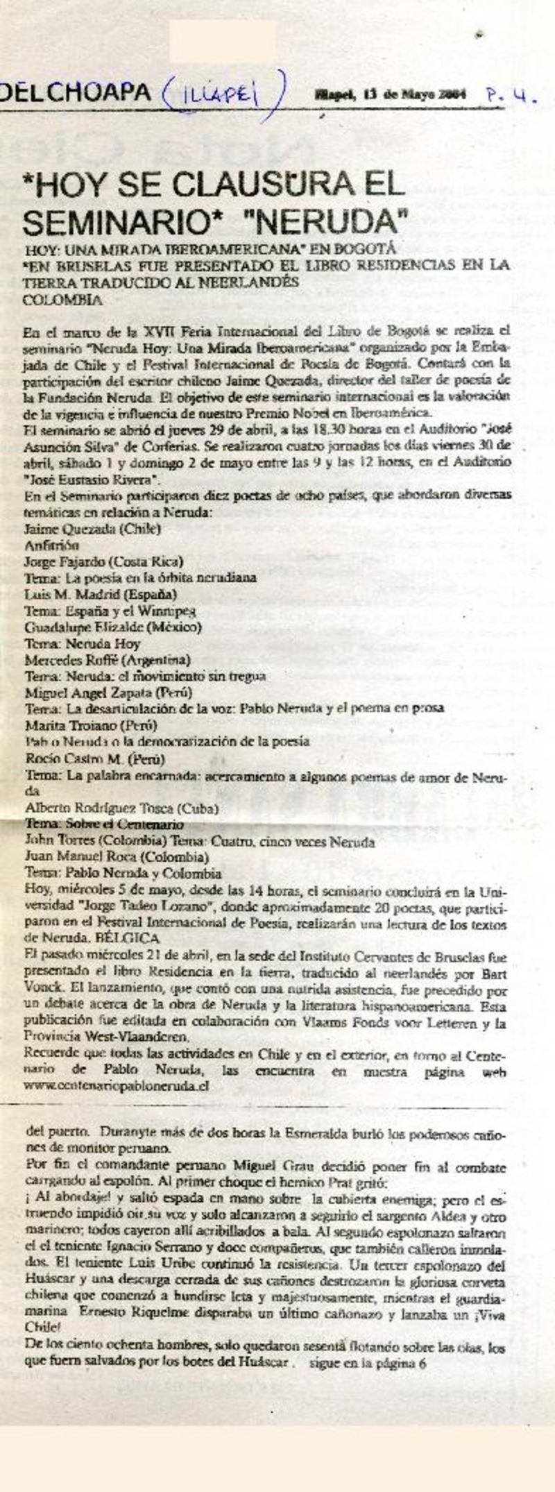 ¡Hoy se clausura el seminario" "Neruda" [artículo]