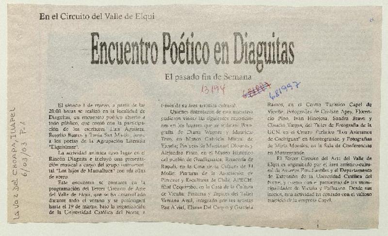 Encuentro poético en Diaguitas. [artículo]