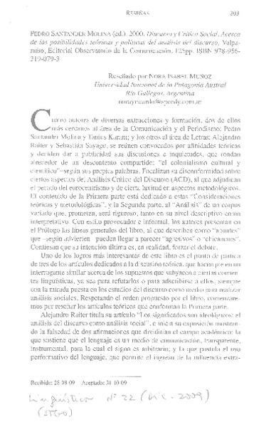 Dicurso de recepción del Premio "Dr. Rodolfo Oroz" [artículo] Pedro Santander Molina.