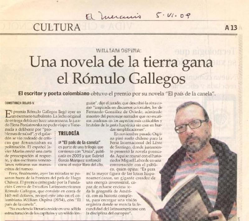 Una novela de la tierra gana el Rómulo Gallegos [artículo] Constanza Rojas V.