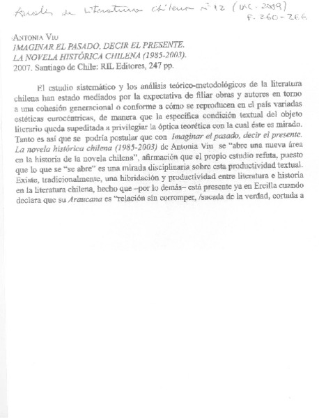Autoras chilenas - Viu, Antonia - Imaginar el pasado, decir el presente