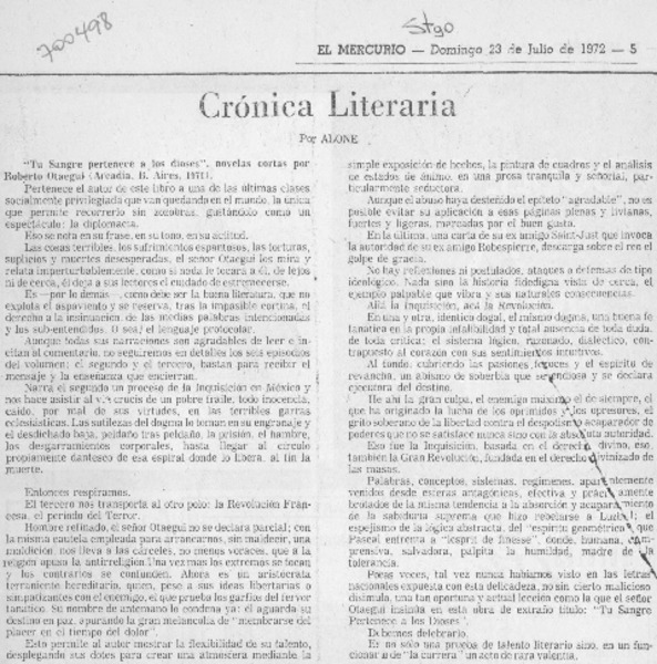 Autores chilenos - Tu sangre pertenece a los dioses - [entrevista] - Otaegui, Roberto - El Mercurio (Santiago, Chile)--