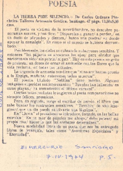Ordenes Pincheira, Carlos - Autores chilenos - Tierra pide silencio