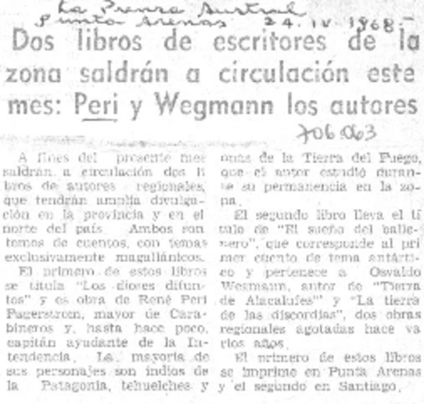 Dos libros de escritores de la zona saldrán a circulación este mes: Peri y Wegmann los autores. [artículo]