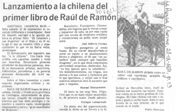 Lanzamiento a la chilena del primer libro de Raúl de Ramón [artículo] Pablo Huneeus.