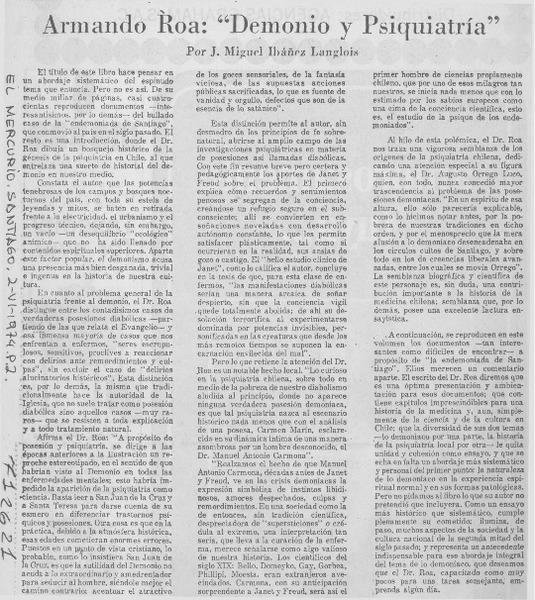 Armando Roa, "Demonio y psiquiatría" [artículo] José Miguel Ibáñez Langlois.