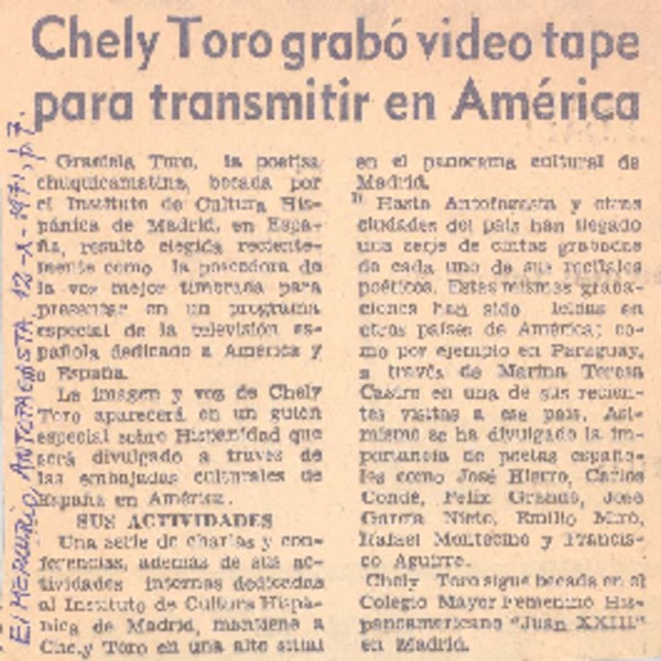Dos años permaneció becada en España la poetisa Chely Toro. [artículo]
