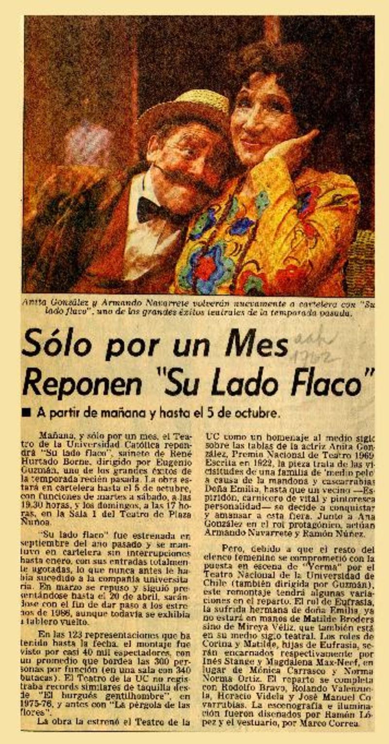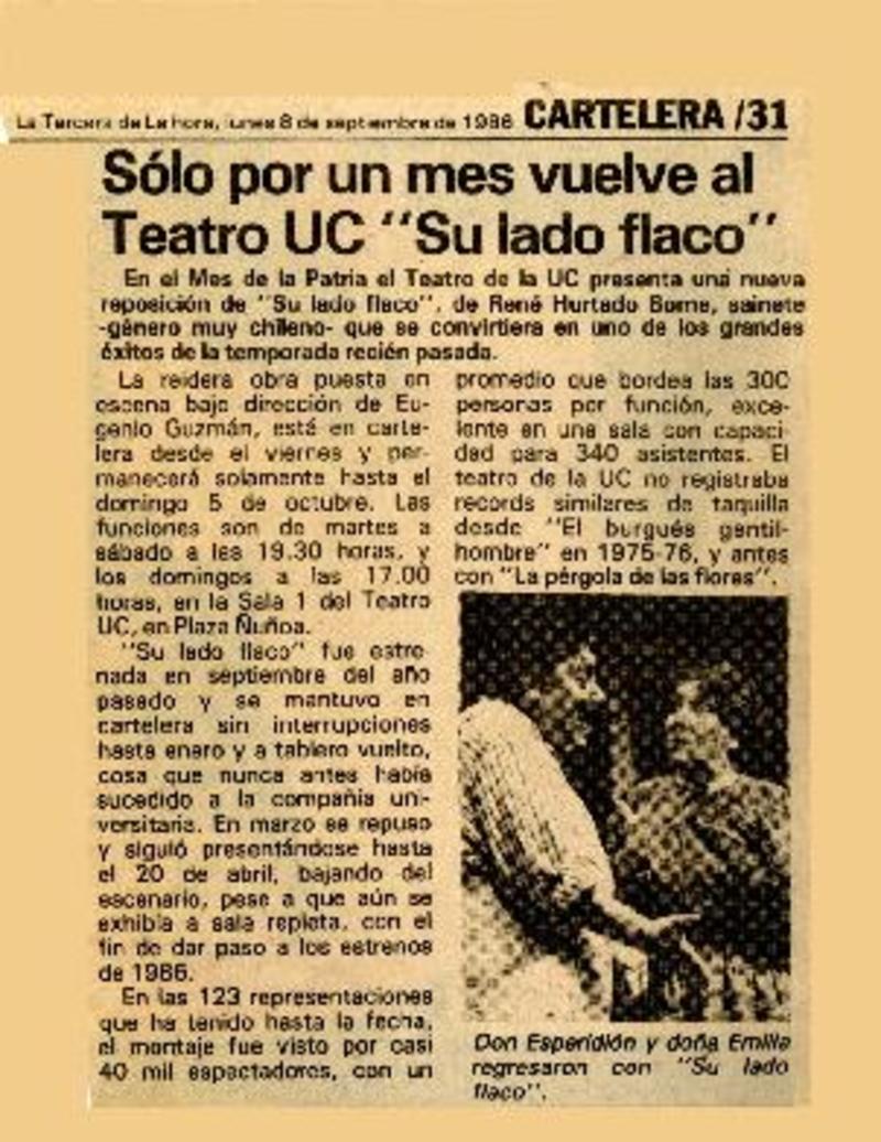 Sólo por un mes vuelve al Teatro UC "Su lado flaco" [artículo].
