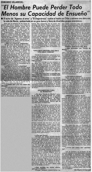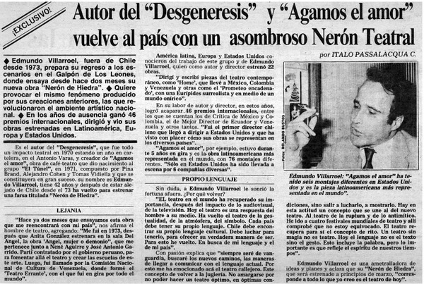 Autor del "degenéresis" y "agamos el amor" vuelve al país con un asombreso Nerón teatral : [entrevistas] [artículo] Italo Passalacqua C.
