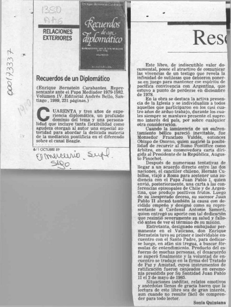 Recuerdos de un diplomático [artículo] Sonia Quintana.