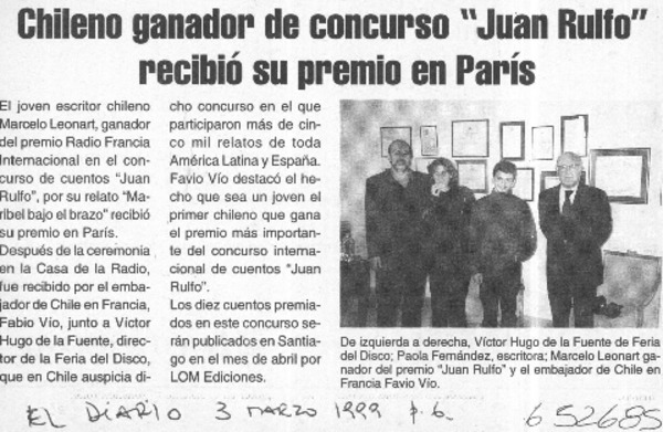 Chileno ganador de concurso "Juan Rulfo" recibió su premio en París [artículo].