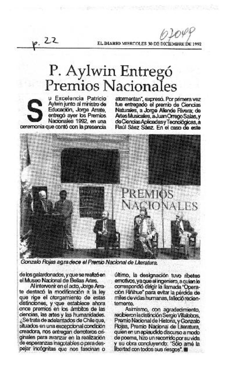 P. Aylwin entregó Premios Nacionales. [artículo]