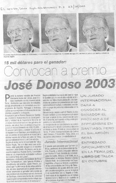 Convocan a premio José Donoso 2003 15 mil dólares para el ganador. [artículo] :