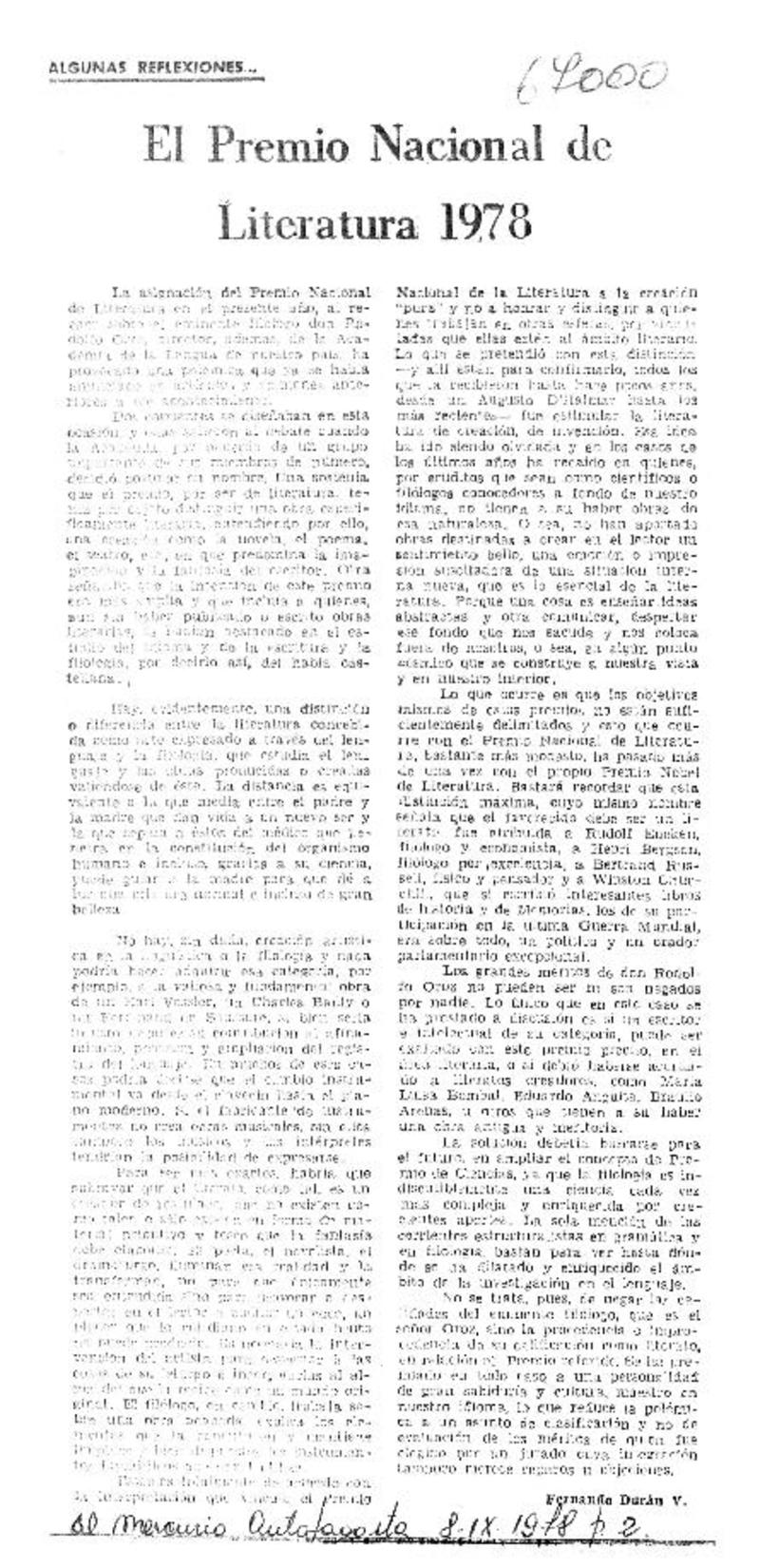 El Premio Nacional de Literatura 1978 [artículo] Fernando Durán.