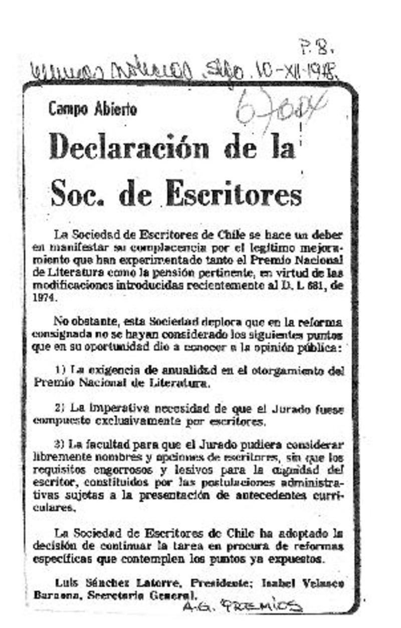 Declaración de la Soc. de Escritores [artículo] Luis Sanchez Latorre.