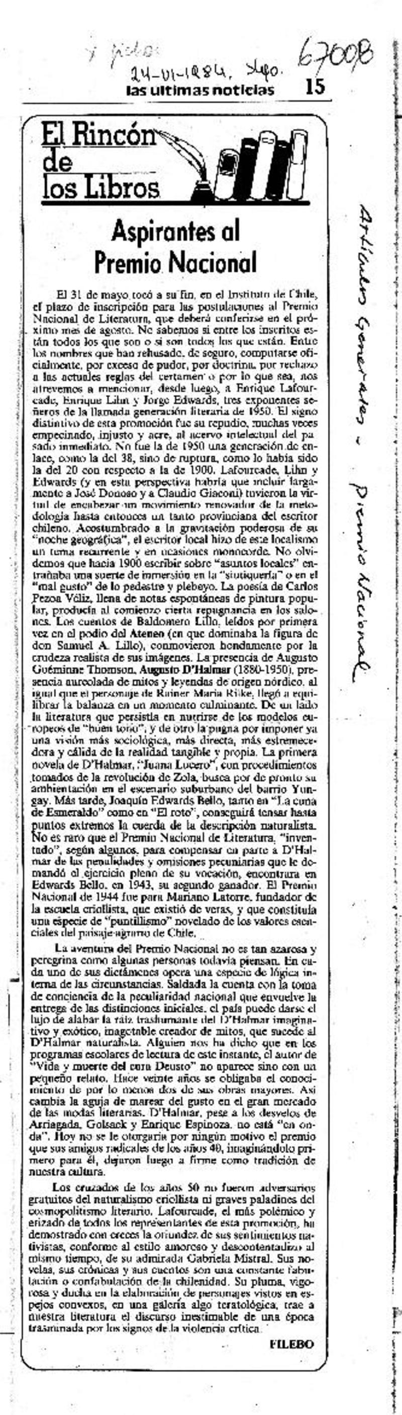 Aspirantes al Premio Nacional [artículo] Filebo.