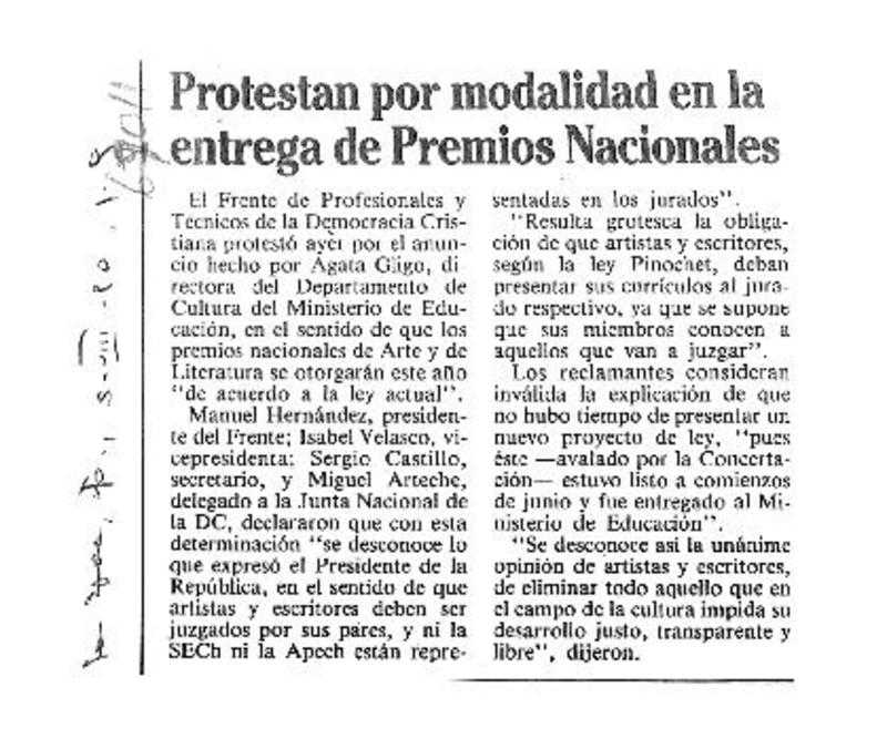 Protestan por modalidad en la entrega de Premios Nacionales. [artículo]