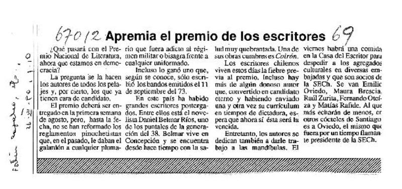 Apremia el premio de los escritores. [artículo]