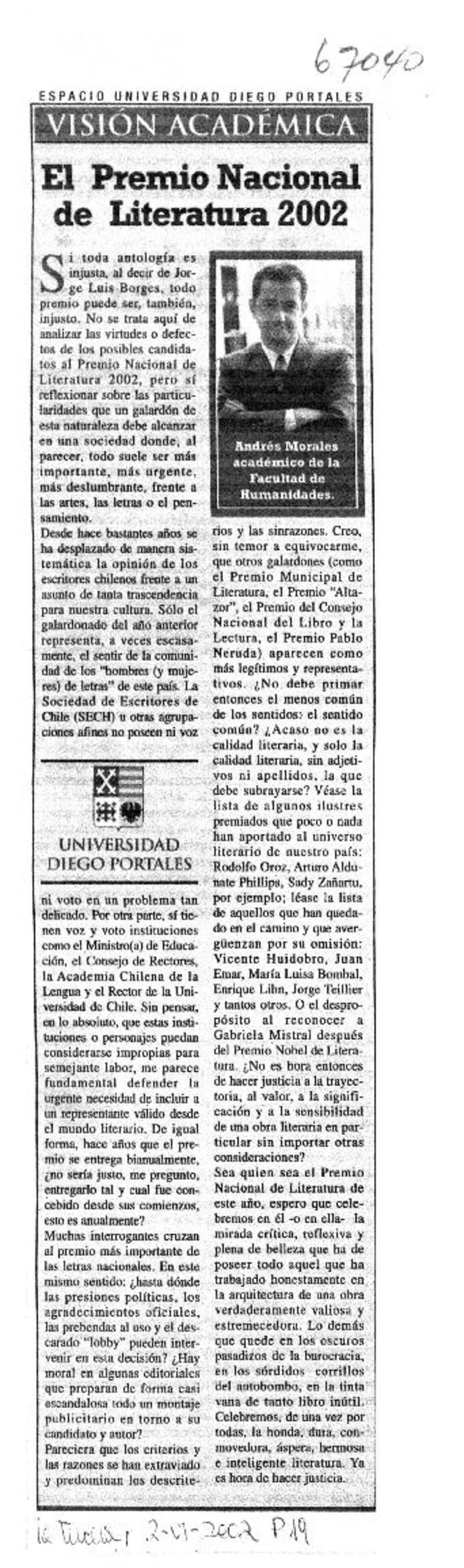 El Premio Nacional de Literatura 2002 [artículo] Andrés Morales.