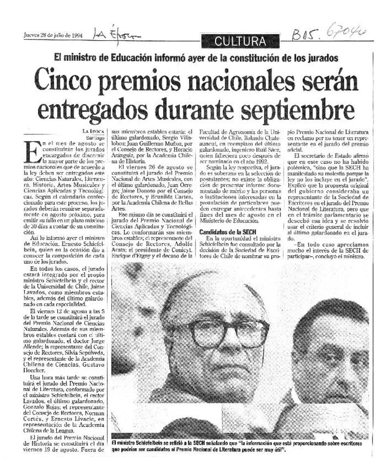 Cinco premios nacionales serán entregados durante septiembre. [artículo]