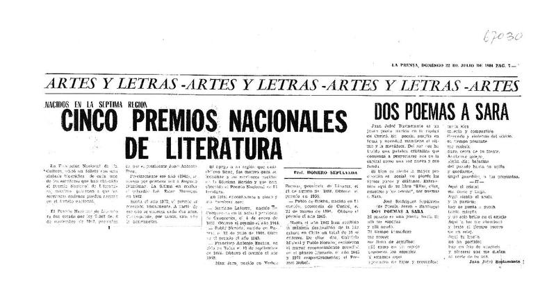 Cinco Premios Nacionales de Literatura [artículo] Luciano del Valle.