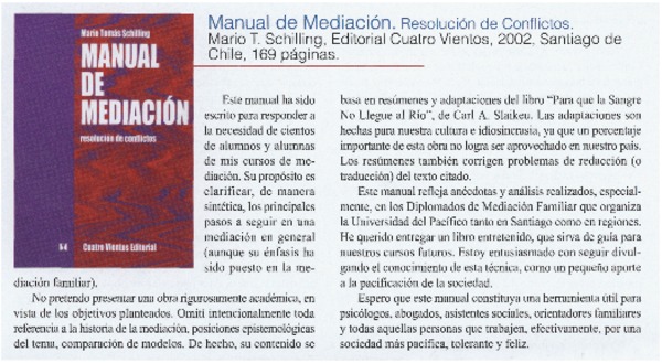 Manual de mediación. Resolución de Conflictos [artículo] Mario T. Schilling.
