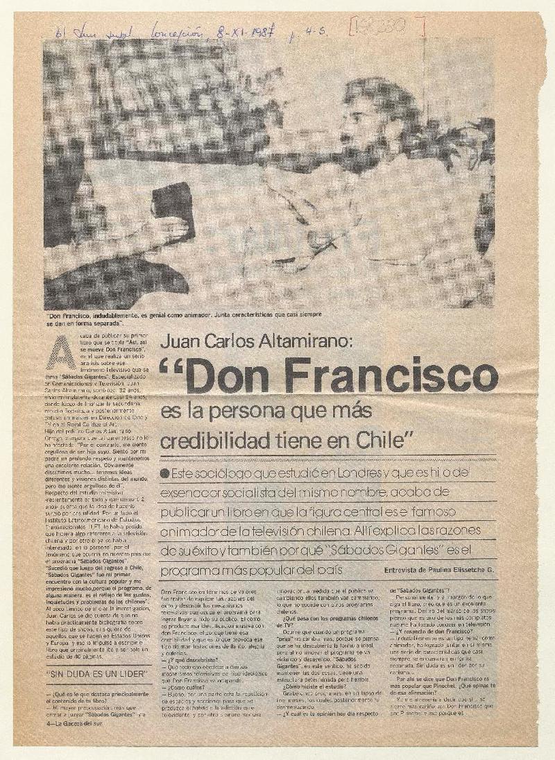 Juan Carlos Altamirano, "Don Francisco es la persona que más credibilidad tiene en Chile" [entrevista] [artículo] : Paulina Elissetche G.