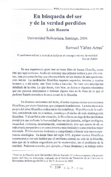 EnBúsqueda del ser y de la verdad perdidos. [artículo] Samuel Yáñez Artus