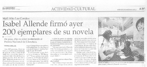 Isabel Allende firmó ayer 200 ejemplares de su novela [artículo] Víctor M. Mandujano.