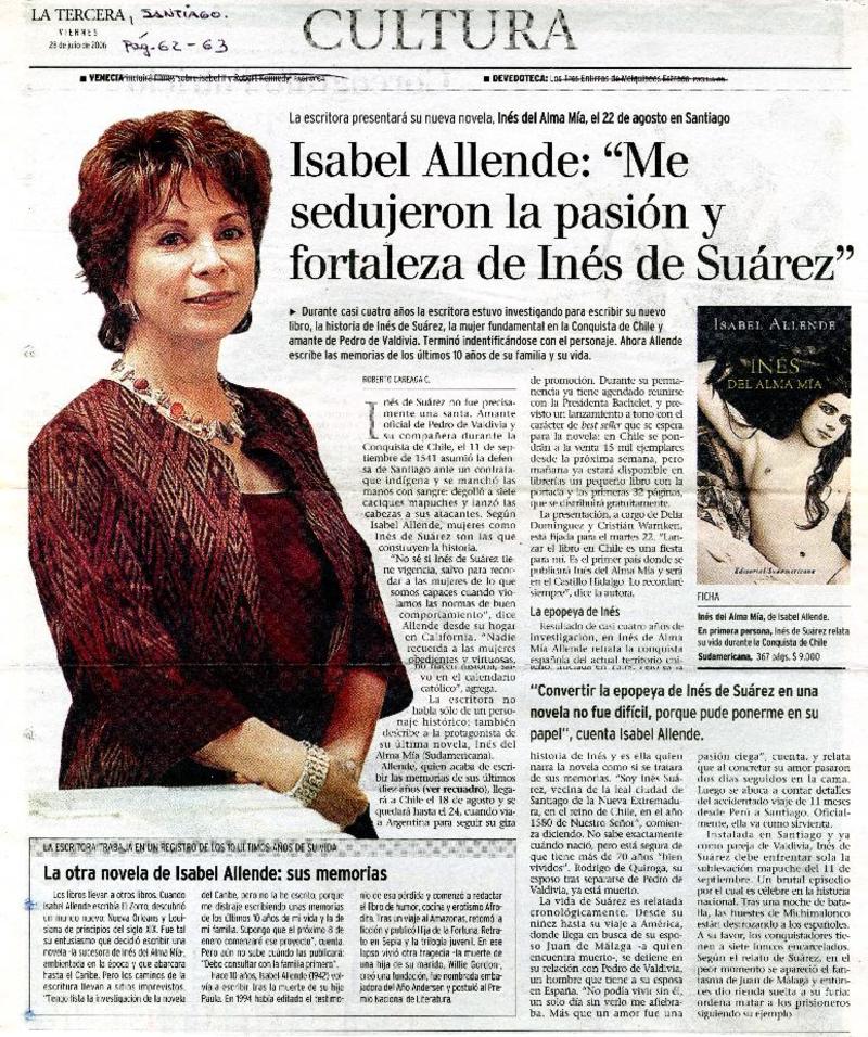 Isabel Allende: "Me sedujeron la pasión y fortaleza de Inés de Suárez" [artículo] Roberto Careaga C.