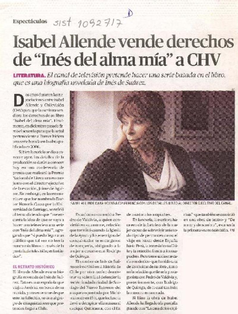 Isabel Allende vende derechos de "Inés del alma mía" a CHV. [artículo].