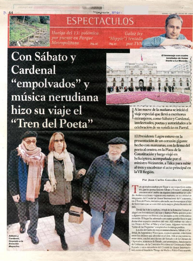Con Sábato y Cardenal "empolvados" y música nerudiana hizo su viaje el "Tren del Poeta" [artículo] Juan Carlos González O.
