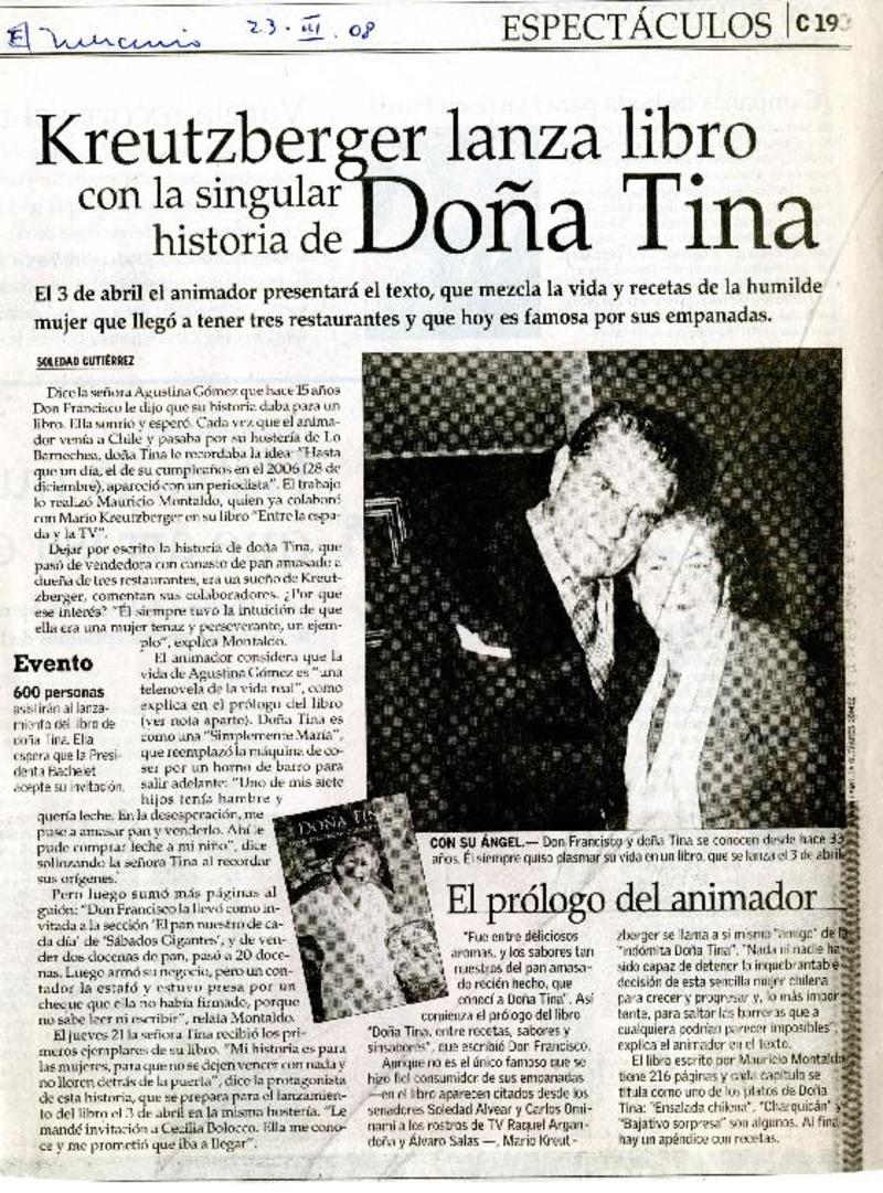 Kreutzberger lanza libro con la singular historia de Doña Tina [artículo] Soledad Gutiérrez.