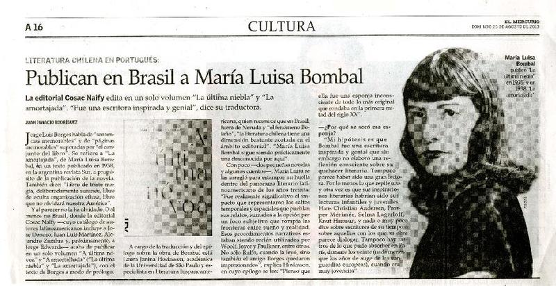 Publican en Brasil a María Luisa Bombal [artículo] Juan Ignacio Rodríguez