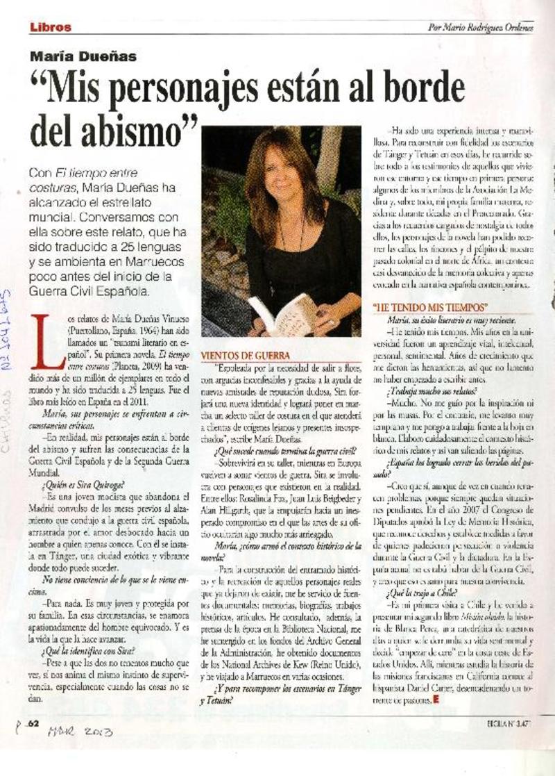 María Dueñas : "a las mujeres aún nos queda un gran trecho por andar" (entrevista) [artículo] Francisca Olivares.