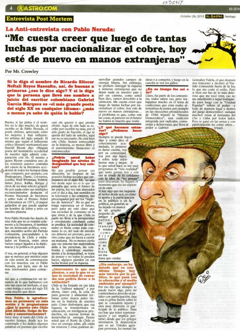 La Anti-entrevista con Pablo Neruda: Me cuesta creer que luego de tantas luchas por nacionalizar el cobre, hoy esté de nuevo en manos extranjeras [artículo] Mr. Crowley