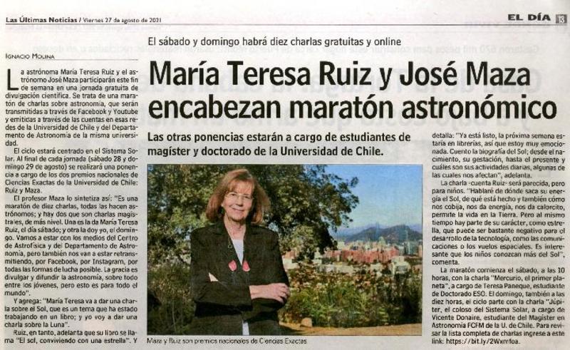 María Teresa Ruíz y José Maza, encabezan maratón astronómico [artículo] Ignacio Molina.