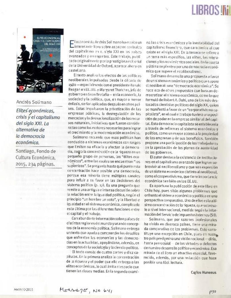 Elites económicas, crisis y el capitalismo del siglo XXI. La alternativa de la democracia [artículo] Carlos Huneeus.